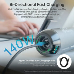 Fast, smart charging: 140 W bi-directional USB-C fast charge in ~90 minutes—and it can double as a power bank for your phone or action cam.